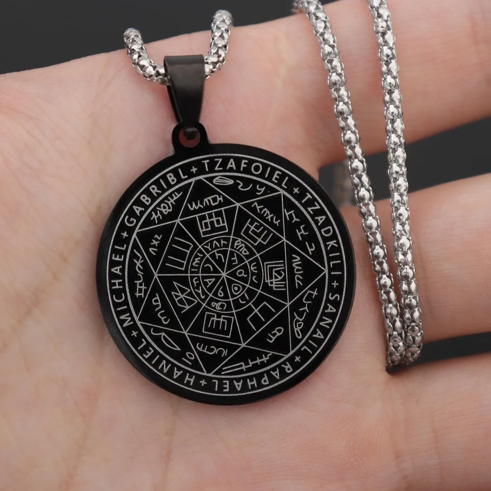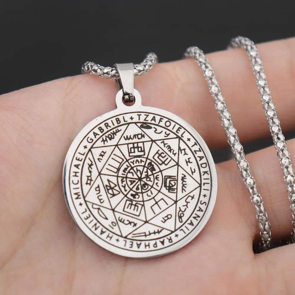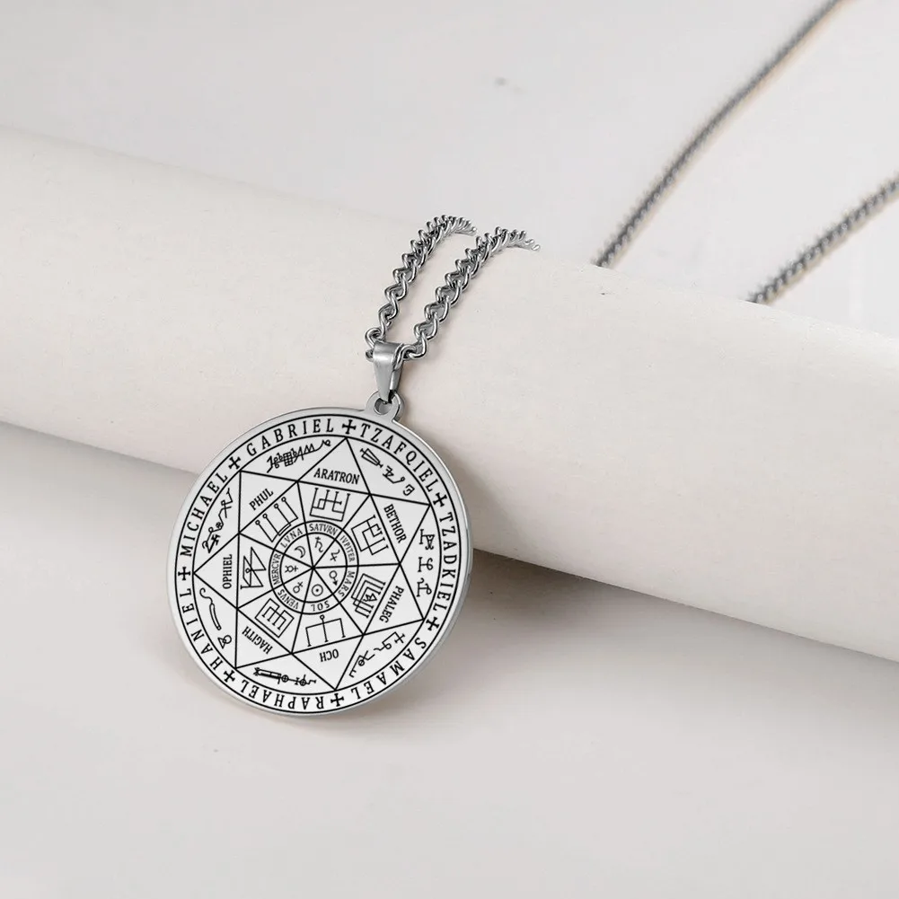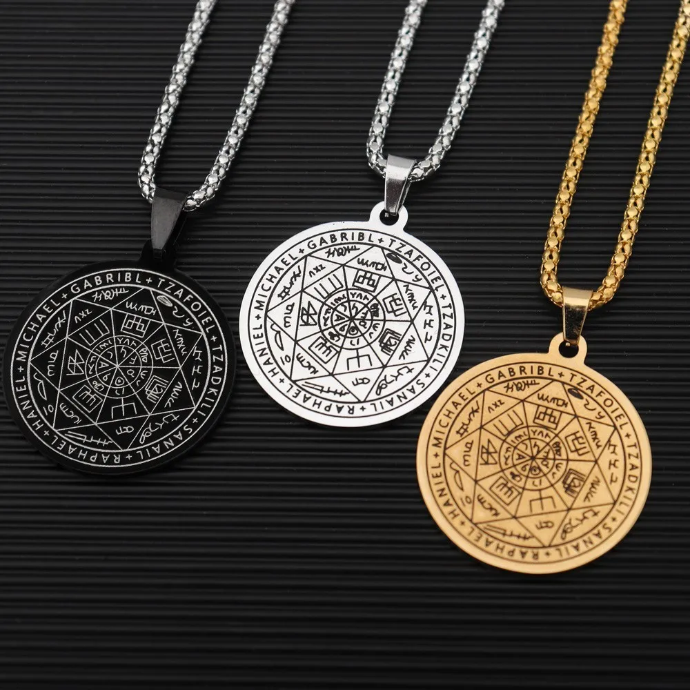 所罗门·卡巴拉护身符不锈钢项链,七天使四字真言印章吊坠,防水珠宝项链
