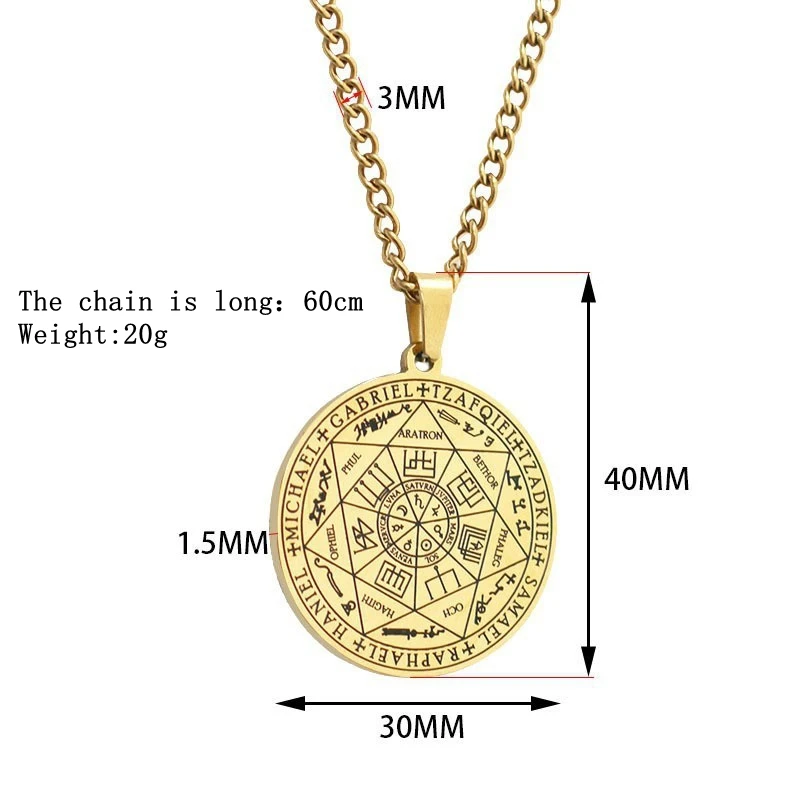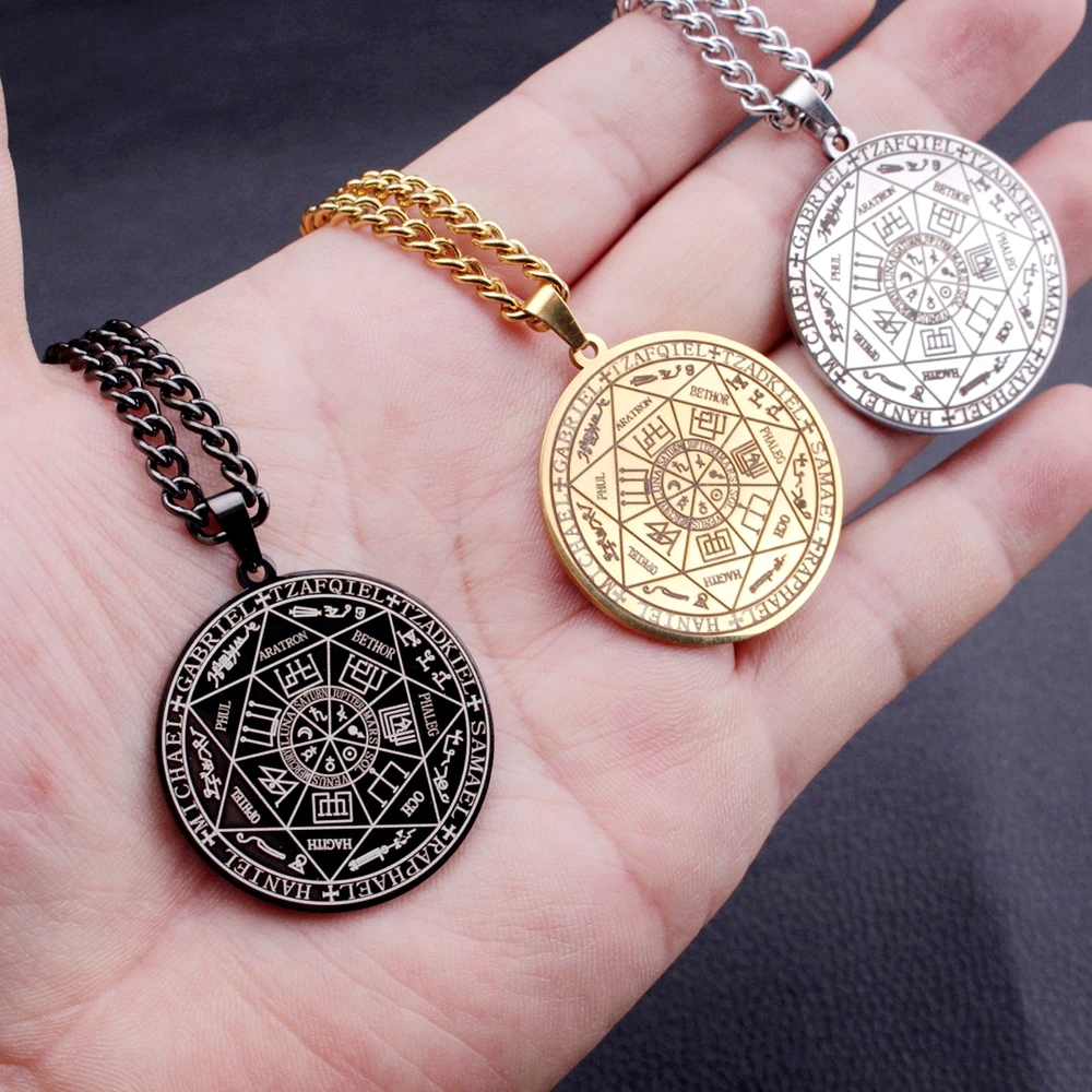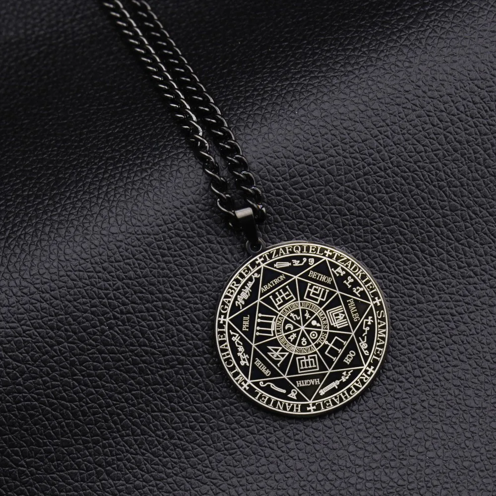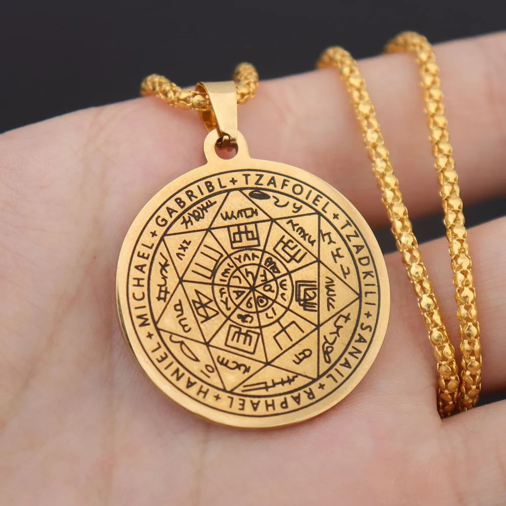所罗门·卡巴拉护身符不锈钢项链,七天使四字真言印章吊坠,防水珠宝项链